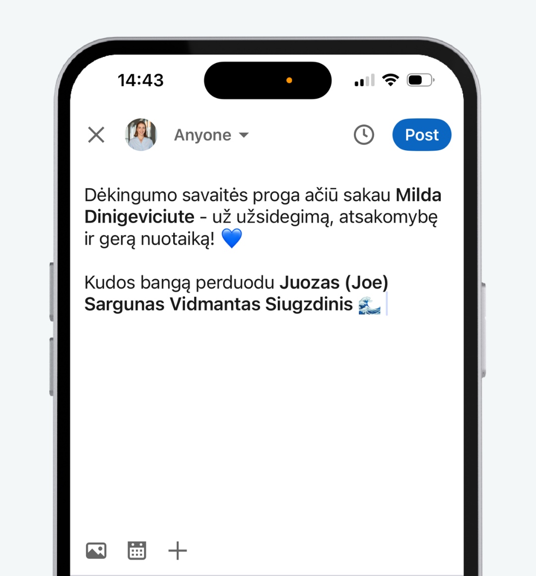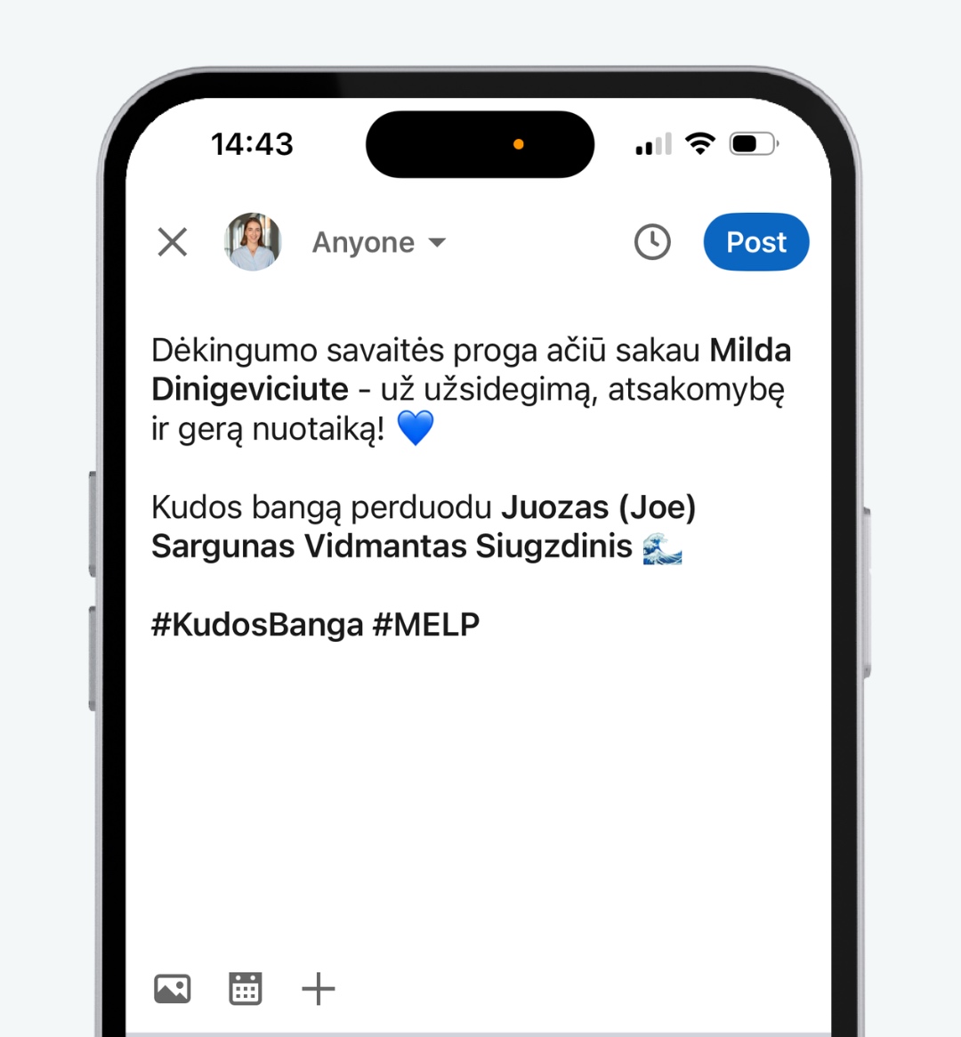 Parašykite įrašą savo „LinkedIn" arba „Facebook" paskyroje ir padėkokite kolegoms už darbą, palaikymą, bendrystę ar tiesiog buvimą šalia